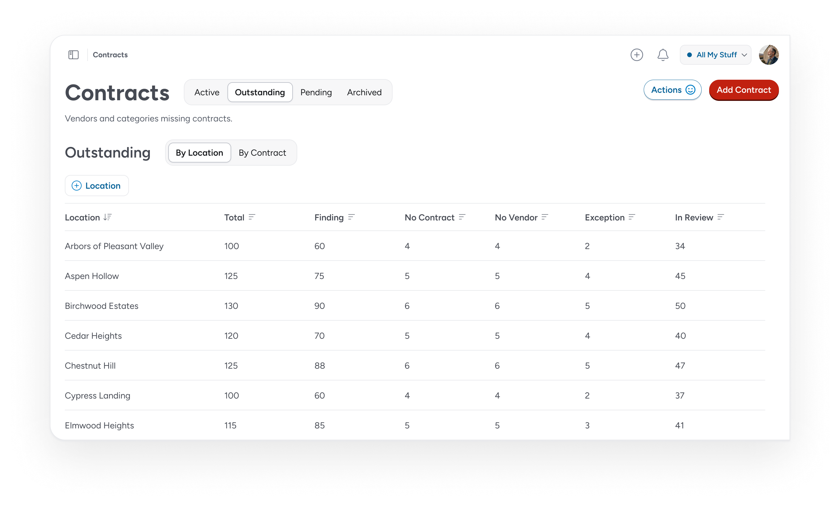 Regional managers get a portfolio-wide view, filterable by location to see where gaps are concentrated or by contract type to spot patterns across the portfolio.